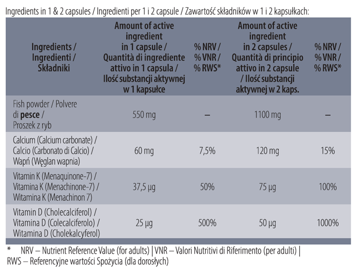 Składniki: Proszek ryb, wapń (węglan wapnia), żelatyna rybia, witamina K (menachinon 7), witamina D (cholekalcyferol), substancja przeciwzbrylająca (sole magnezowe kwasów tłuszczowych).